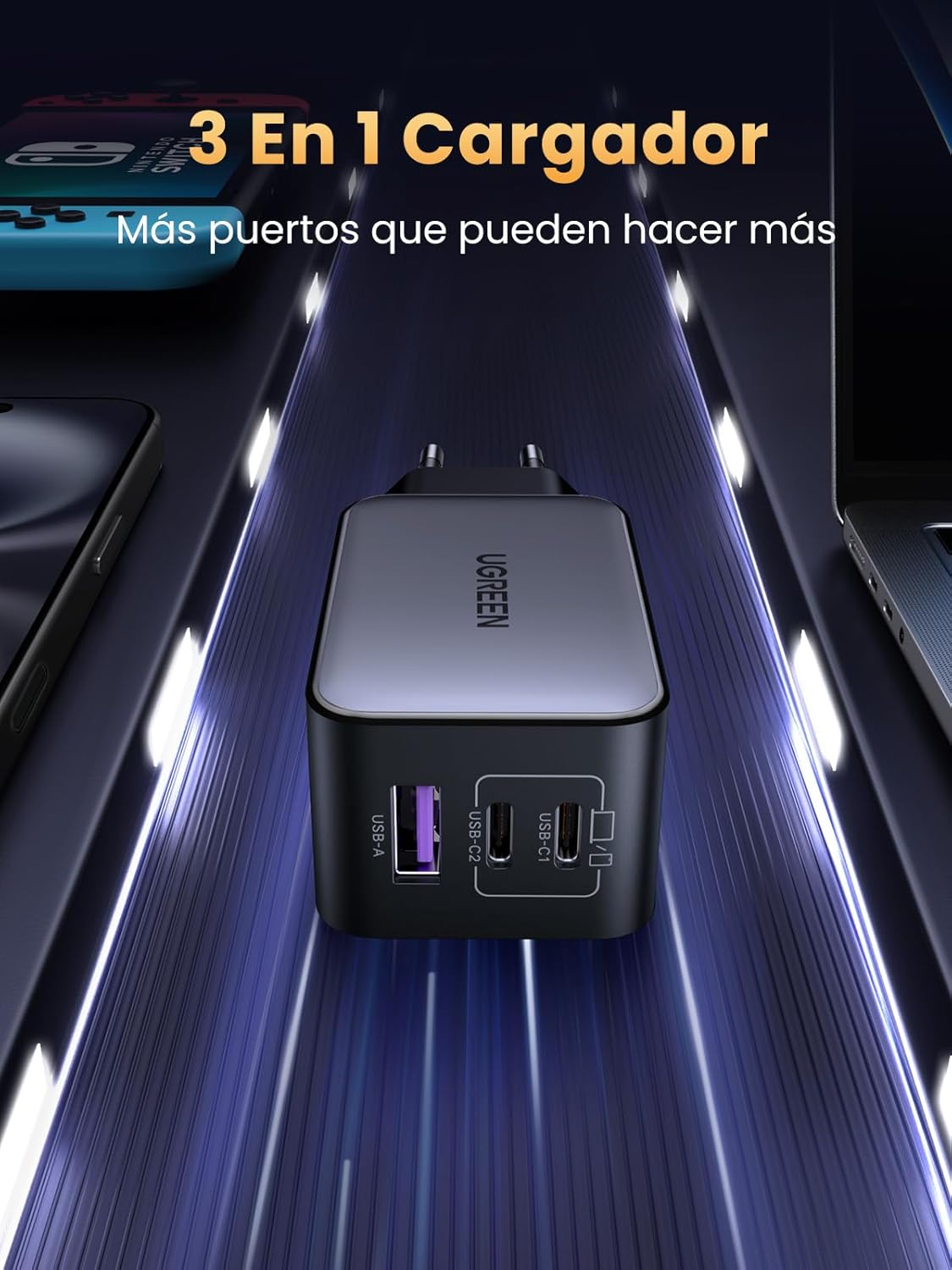 - -UGREEN 65W USB C cargador está equipado con 2 USB-C y 1 USB-A, que pueden cargar 3 dispositivos al mismo tiempo